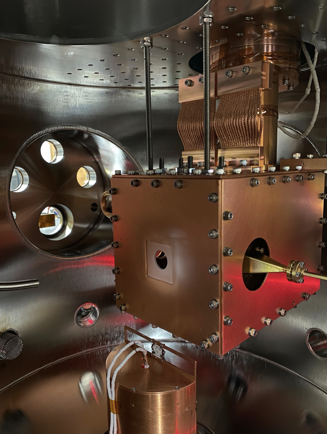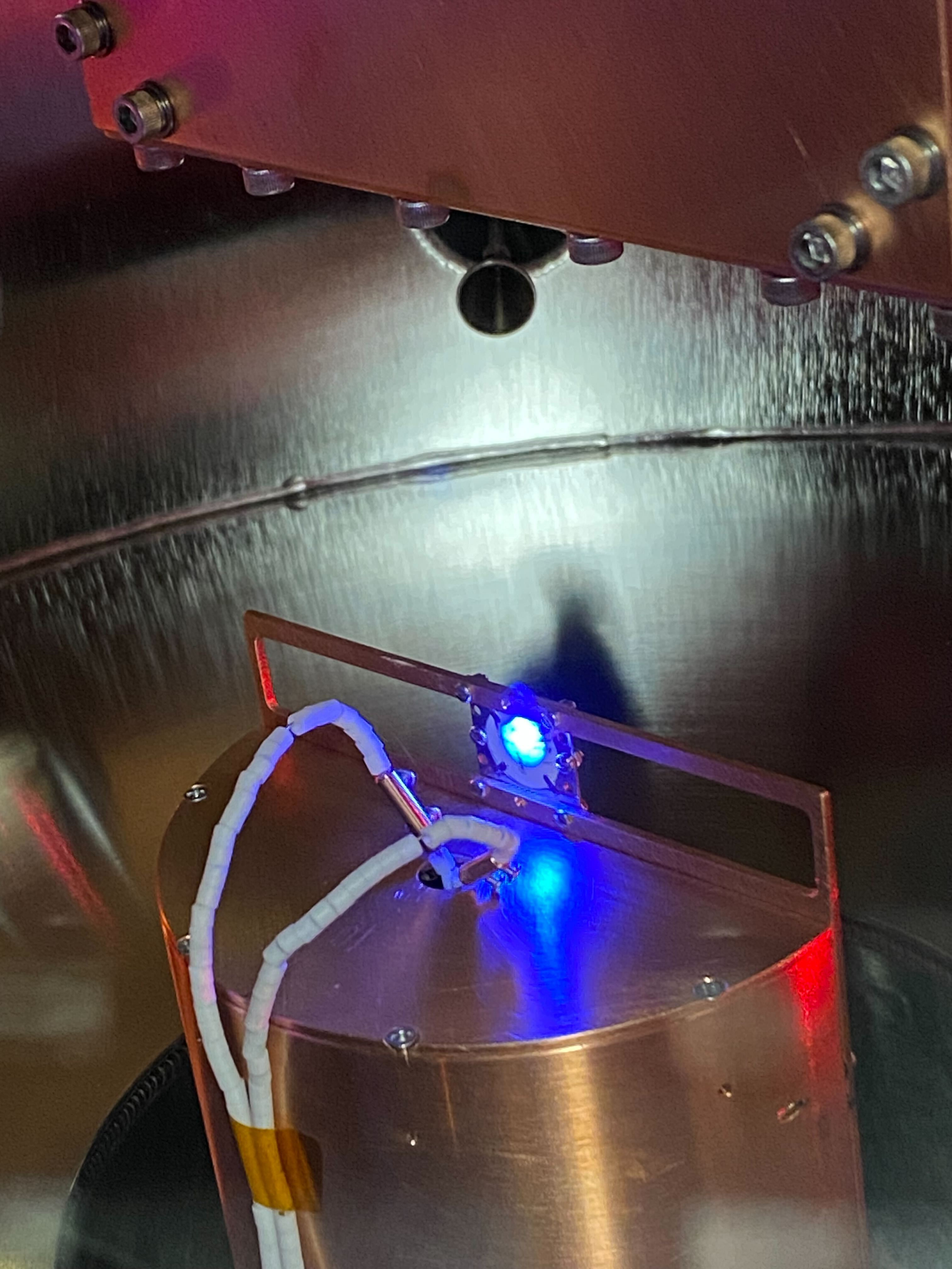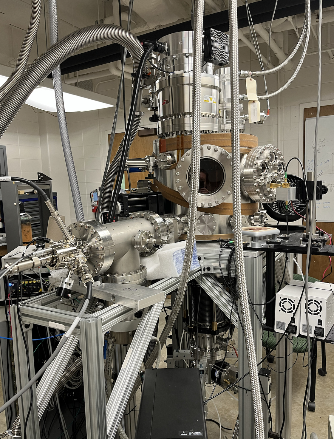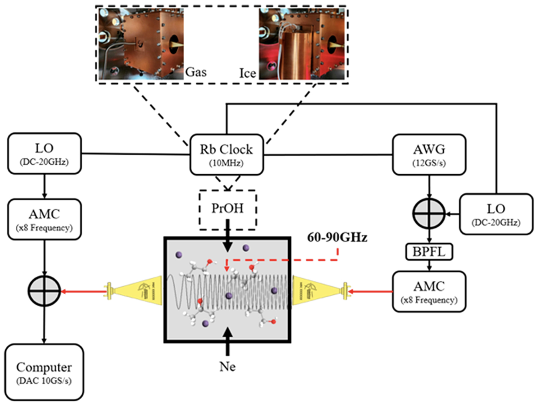 As shown below, the UHV apparatus contains a 4 K stage to generate neat or binary ices. Following deposition, the ice sample may be slowly warmed via temperature programmed desorption (TPD), or first exposed to ionizing radiation via a 10 K electron gun or VUV lamp before TPD begins. As the molecules reach their sublimation temperature and enter the gas phase, they are injected into the 25 K neon buffer gas cell thermally linked to a separate cold head, where they are promptly cooled and detected with chirped-pulse mm-wave spectroscopy.